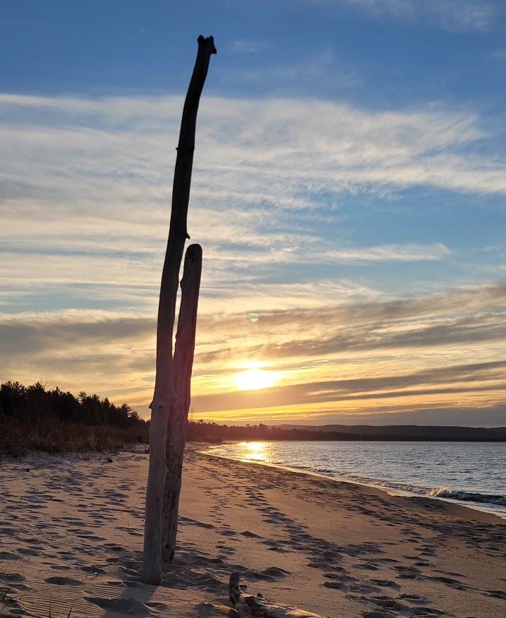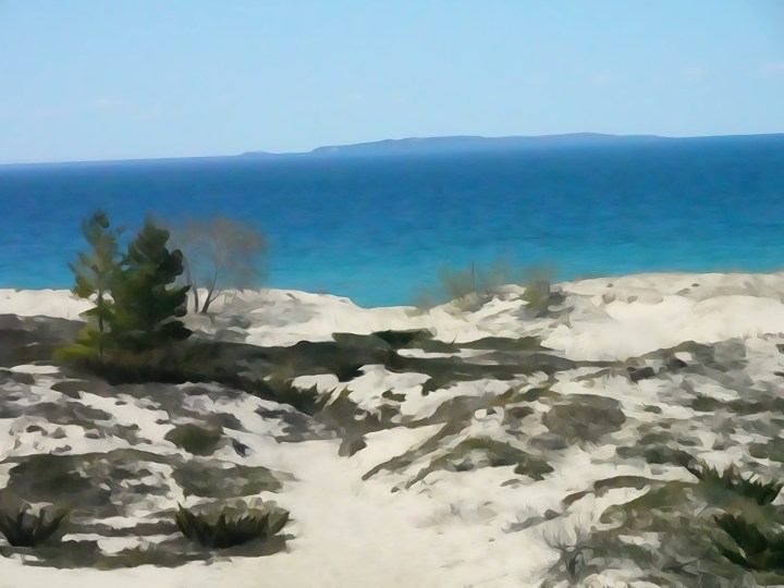 They stepped foot out of the forest and into a meadow. Me scanned the world around her. The view took her breath away. She was at the top of a bluff… sand and dune grass surrounded her. She saw milkweed flaunting their pods in the distance. Small yellow flowers danced in the wind. She gulped the air…she could smell the water …she could sense the sun.
