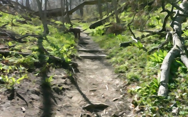 Light was darting between the crevices of the canopy above. The topography of the earth was beginning to transition. The dark black earth and the beds of composting leaves were transforming into sand and dune grass.